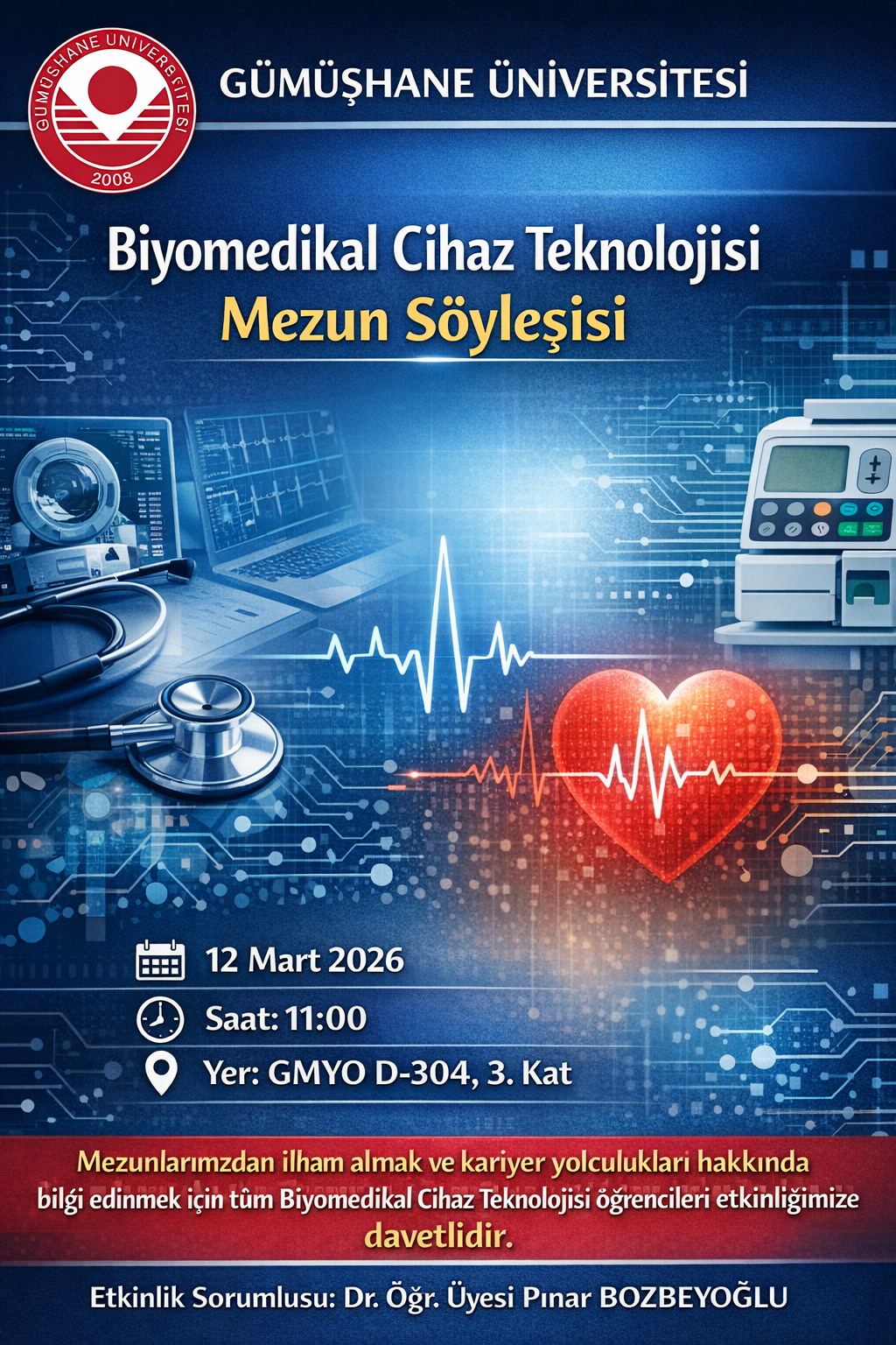 Gümüşhane Üniversitesi Gümüşhane Meslek Yüksekokulu Biyomedikal Cihaz Teknolojisi Programı tarafından düzenlenen “Biyomedikal Cihaz Teknolojisi Mezun Söyleşisi” etkinliği gerçekleştirilecektir.
