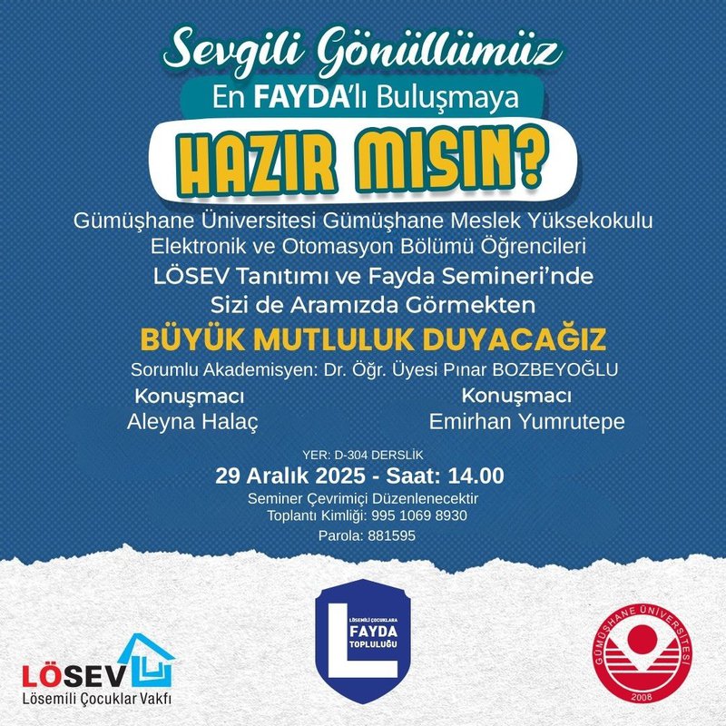 Gümüşhane Meslek Yüksekokulu ev sahipliğinde düzenlenecek bu anlamlı etkinlikte; LÖSEV’in çalışmaları, gönüllülüğün toplumsal etkisi ve fayda temelli sosyal sorumluluk projeleri hakkında değerli paylaşımlar yapılacaktır. Toplumsal farkındalığı artırmayı ve gönüllülük bilincini güçlendirmeyi amaçlayan LÖSEV Tanıtımı ve Fayda Seminerine davetlisiniz.